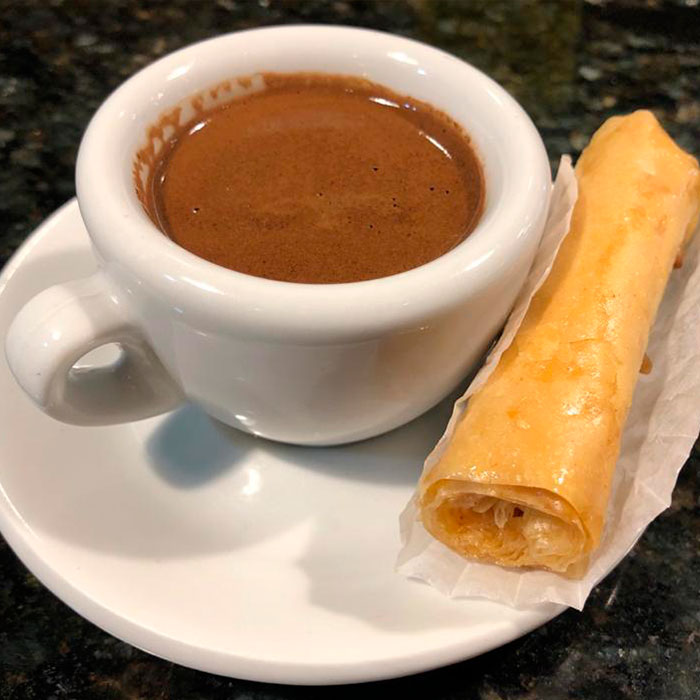 Tenemos una variedad de bebidas de café: americano, árabe, árabe especial, expresso, expreso cortado, capuchino europeo, mocca late, chocolate, té de cardamomo y de sabores diversos.